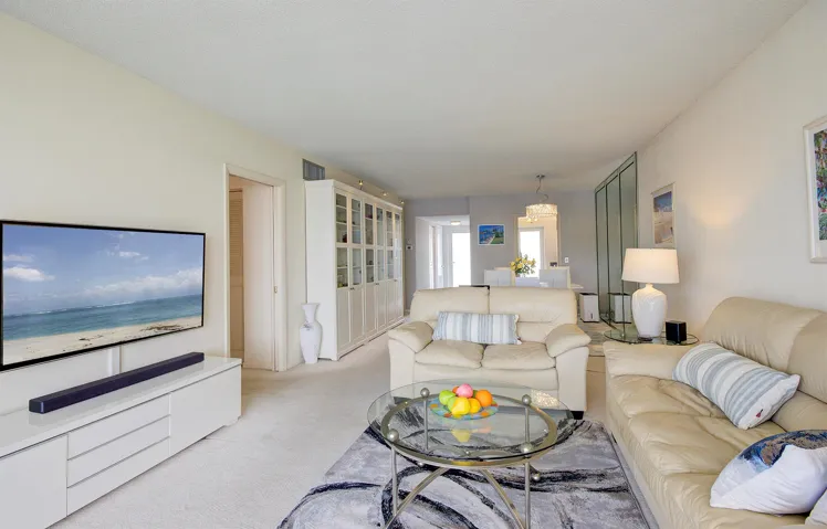 Escape to this bright, beautiful, and fully appointed waterfront condo–your perfect seasonal retreat. The open-concept living area offers comfortable seating and a serene, coastal-inspired decor with blue accents, leading to a balcony with stunning canal views.The elegant dining area is set beneath a tiered crystal chandelier, featuring a modern white table and a dramatic mirrored wall that enhances the light and space. The adjacent galley kitchen boasts chic white cabinetry, stainless steel appliances, and a striking navy blue tiled backsplash contrasted by blue-gray countertops. This condo offers a clean, sophisticated, and efficient base for an ideal Florida getaway. Enjoy the best of the waterfront lifestyle.